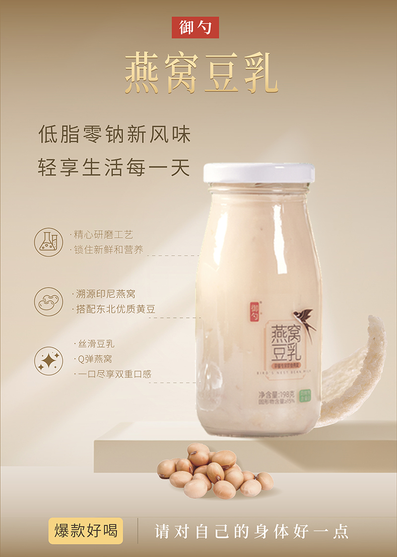 御勺燕窩豆乳創(chuàng)新性地將大豆與燕窩相結(jié)合,每瓶含水發(fā)燕窩200mg,真材實料,滿滿都是誠意。它選用東北黑土地自然生長的一級非轉(zhuǎn)基因大豆,搭配印尼進(jìn)口優(yōu)質(zhì)燕窩,從源頭保障品質(zhì)。制作過程中運(yùn)用破壁研磨技術(shù),使得口感細(xì)膩醇厚,同時最大程度保留養(yǎng)分不流失 。經(jīng)過高溫滅菌與無菌罐裝,產(chǎn)品配料干凈,0添加、無防腐,讓消費(fèi)者喝得放心。