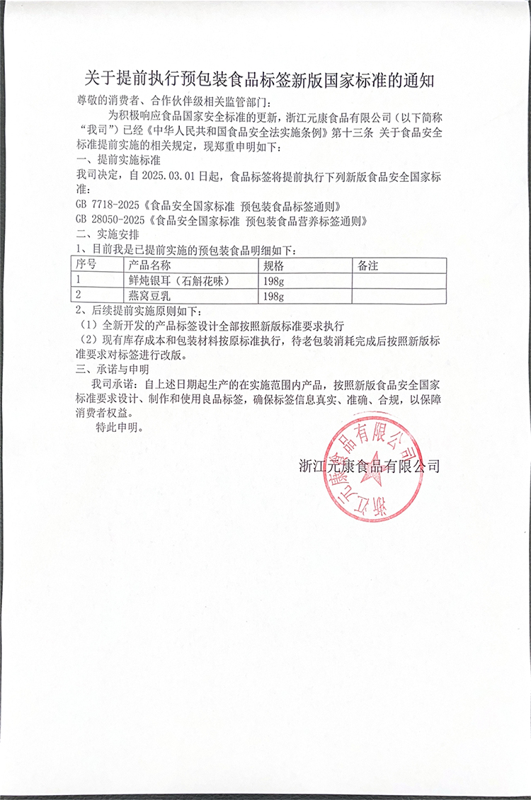 關于提前執行預包裝食品標簽新版國家標準的通知
